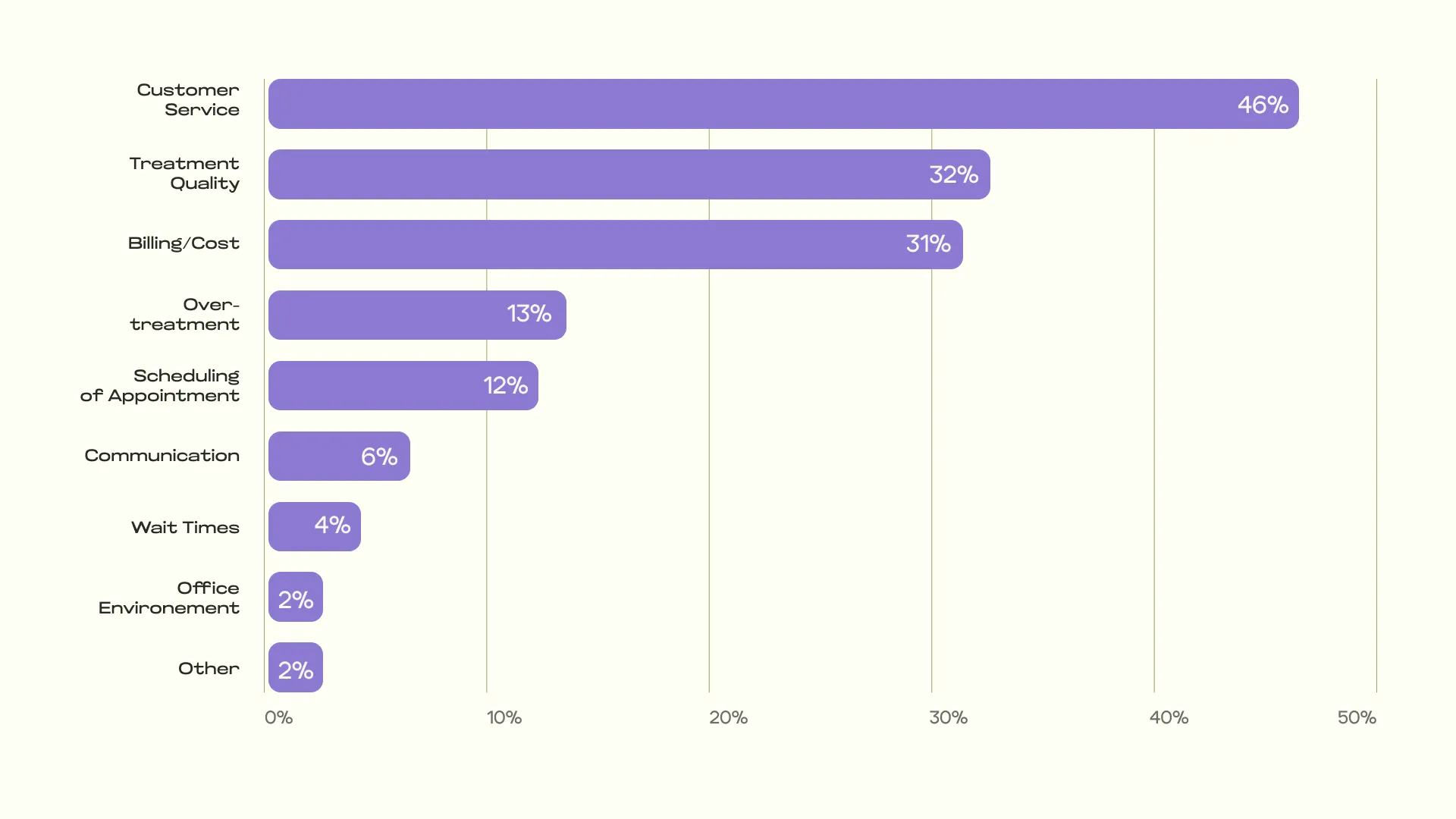 While treatment quality remains important, it is not the main driver of dissatisfaction. Instead, patients often focus on how they were treated as people: the warmth of the staff, the clarity of communication, the ease of booking, and even the atmosphere of the clinic.