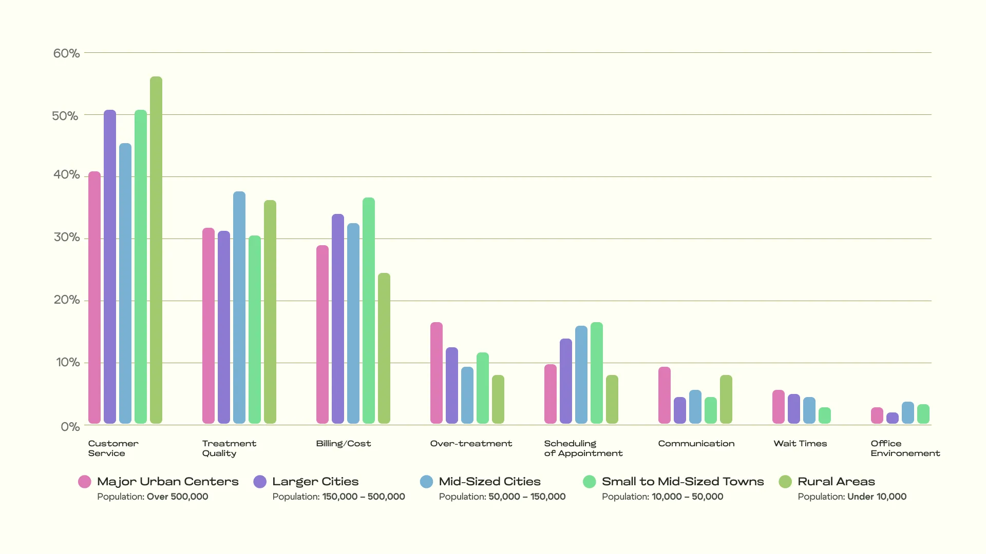 - Major urban centers (500,000+): Complaints were more diverse ranging from over-treatment and aggressive upselling to wait times and poor communication.