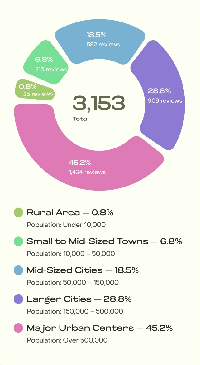 - Rural areas (under 10,000 people): Patients valued personal service and relationships. Complaints here leaned heavily toward Customer Service (42–56%).