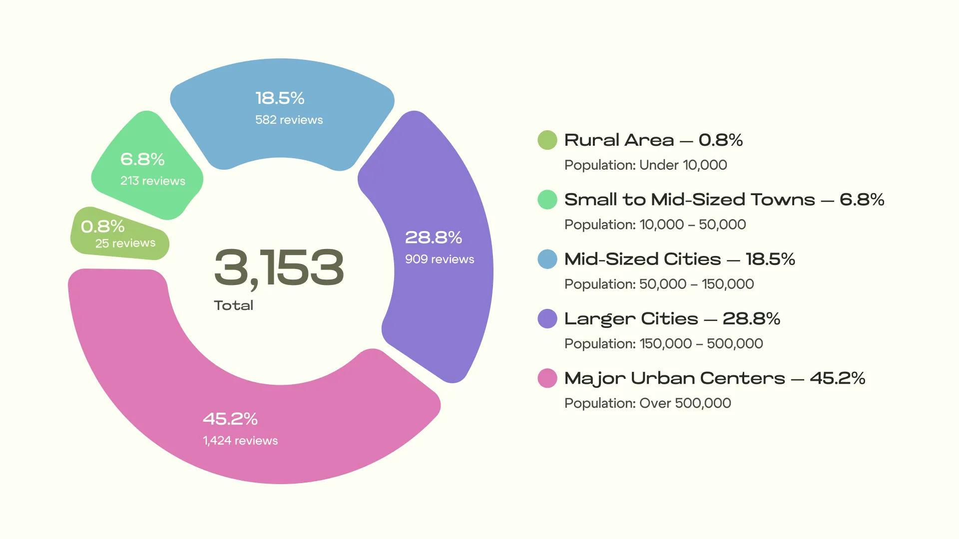 • Rural areas (under 10,000 people): Patients valued personal service and relationships. Complaints here leaned heavily toward Customer Service (42–56%).